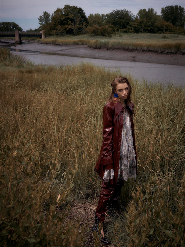 Marta Piekarz wears the Burgundy Vinyl Shirt Dress for L'Officiel USA