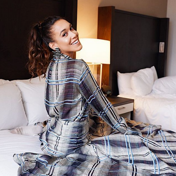 Actress Jeanine Mason wears Victoria Hayes Fall 2019 ‘Wednesday Corset Mini Dress’ to an NBC executive party