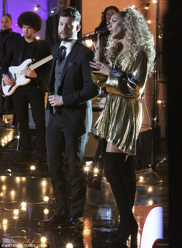Leona Lewis wears Victoria Hayes Gold Lame Wrap Top as a dress while performing on BBC’s “The One”