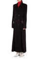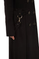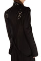 The wool-blend Bondage coat is a long, slim fitting, double-breasted silhouette accented with silver-tone metal hardware and detachable straps. It’s an elevated take on a classic style; lined with black and white printed charmeuse and trimmed with black patent leather.